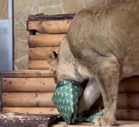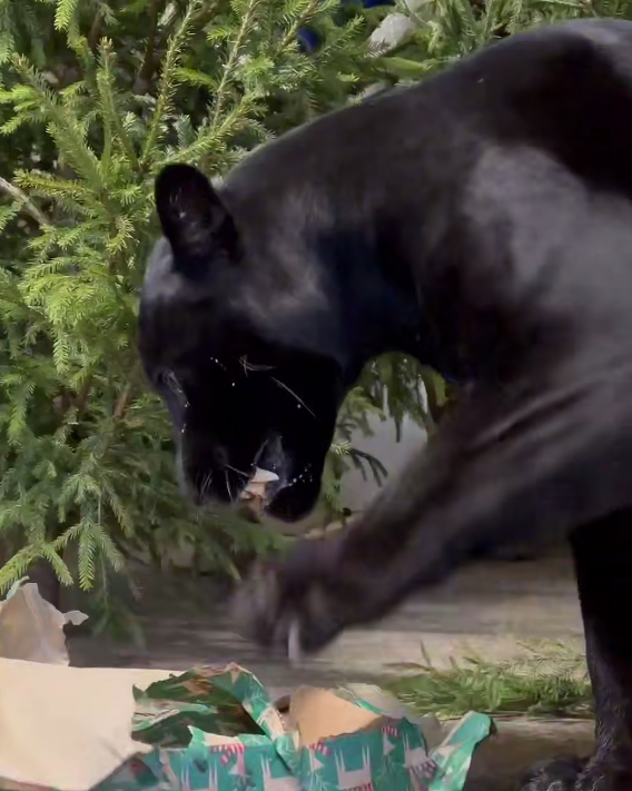 На этот раз подарки получили черный ягуар, харза, львы, еноты и пума. По словам работников, они за минуту разрывают упаковку, а содержимое подарка быстро оказывается в клыкастой пасти.
