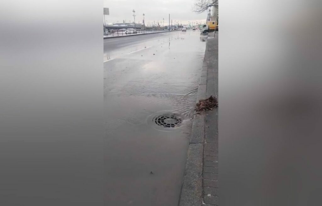 Сообщение о протечке поступило в ведомство днем 19 ноября. Стихия в огромном количестве скопилась на проезжей части и тротуаре у Санкт-Петербургской академии художеств.