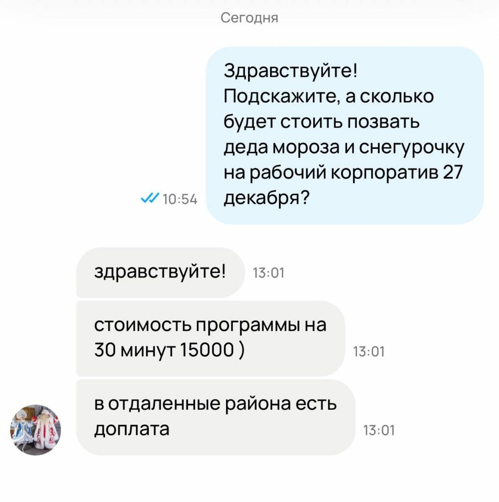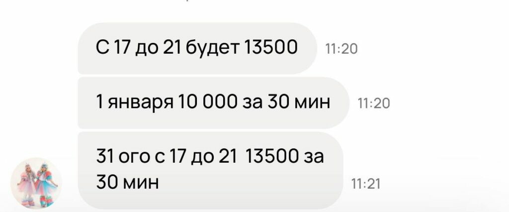 В объявлениях на «Авито» в среднем указаны цены от 8 тыс. рублей, но по факту вечеринка со сказочными персонажами будет стоить гораздо дороже. За корпоратив до 27 декабря просят от 19 980 до 24 980 рублей. Такие деньги аниматоры берут за полчаса выступления. Уже с 28 декабря цена вырастет до 24-34 тыс. рублей.