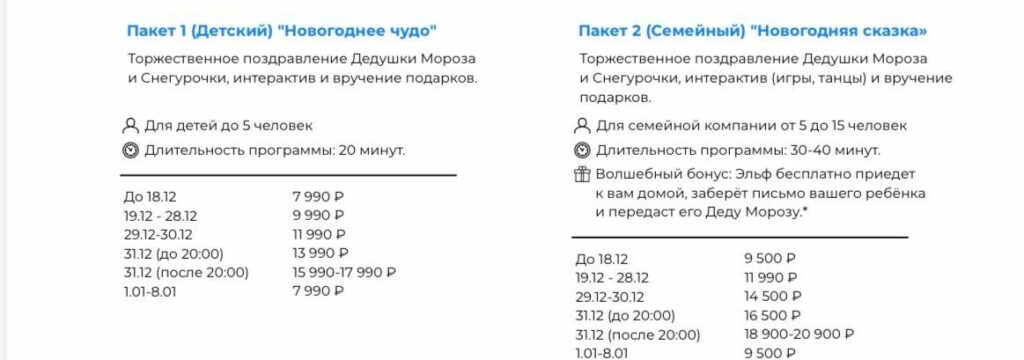 Дешевле стоит организация праздника для ребенка или детей на дому. До 19 декабря 20-минутная программа обойдется в 7 тыс. рублей, с 19 по 28 – 9 990 рублей, в новогоднюю ночь Дед Мороз и Снегурочка будут готовы прийти и подарить подарок ребенку за 15-17 тыс. рублей. За большую семью до 20 человек и выступление длительностью 40-50 минут петербургские аниматоры возьмут 18-20 тыс. рублей.