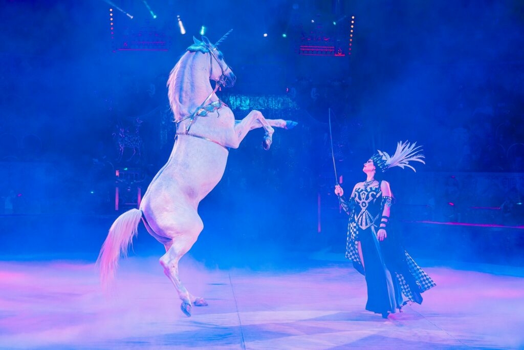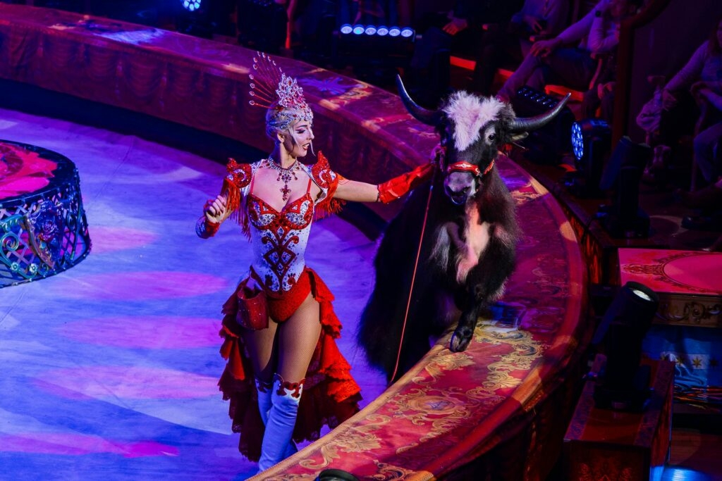Значительная часть программы была посвящена выступлениям с животными. В одном из номеров на манеже появились благородные лесные и северные олени, лисы и русские псовые борзые, а в испанском блоке на арену вышли яки и тореадор. Кульминацией стал аттракцион «Дикий мир», где под руководством дрессировщицы Людмилы Сурковой одновременно выступали девять хищников.