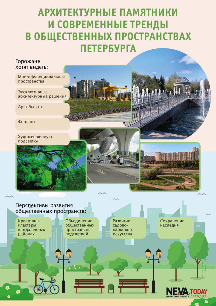 В Петербурге активно развиваются новые общественные пространства, которые совмещают в себе историческую архитектуру и современные тенденции. Эксперты из комитета по государственному контролю, использованию и охране памятников истории и культуры и директор по проектированию и развитию АО «Зенит-Арена» рассказали, какие объекты благоустройства пользуются спросом у местных жителей.