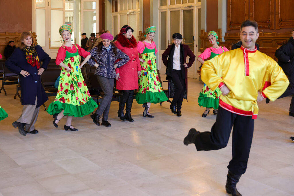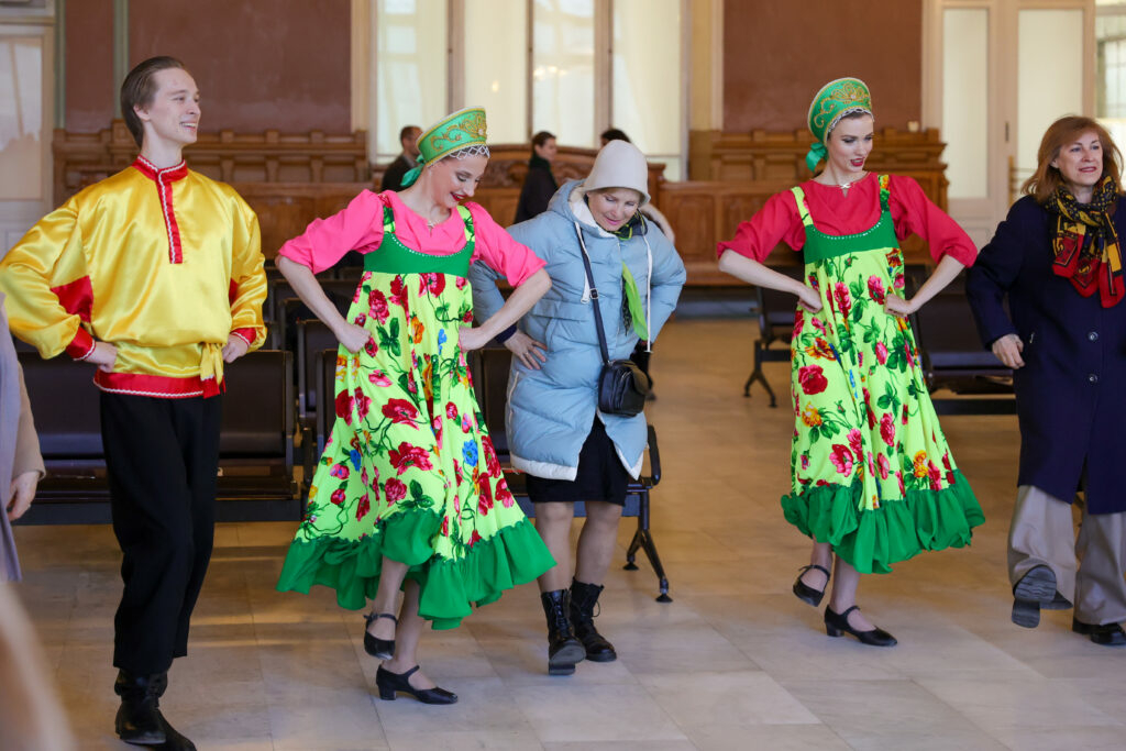 «Петербургский дневник» и артисты Государственного ансамбля танца «Барыня» устроили масштабный флешмоб 17 марта в зале ожидания Витебского вокзала. Артисты предстали перед путешественниками в сарафанах и косоворотках и станцевали «Калинку-малинку».