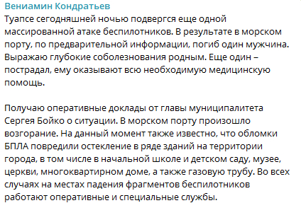 В ночь на 20 апреля 2026 года город Туапсе на Черноморском побережье Краснодарского края подвергся очередной массированной атаке украинских беспилотников . Губернатор Кубани Вениамин Кондратьев в соцсети сообщил о тяжелых последствиях: в морском порту погиб мужчина, еще один местный житель получил ранения и был госпитализирован . Глава региона выразил соболезнования семье погибшего.