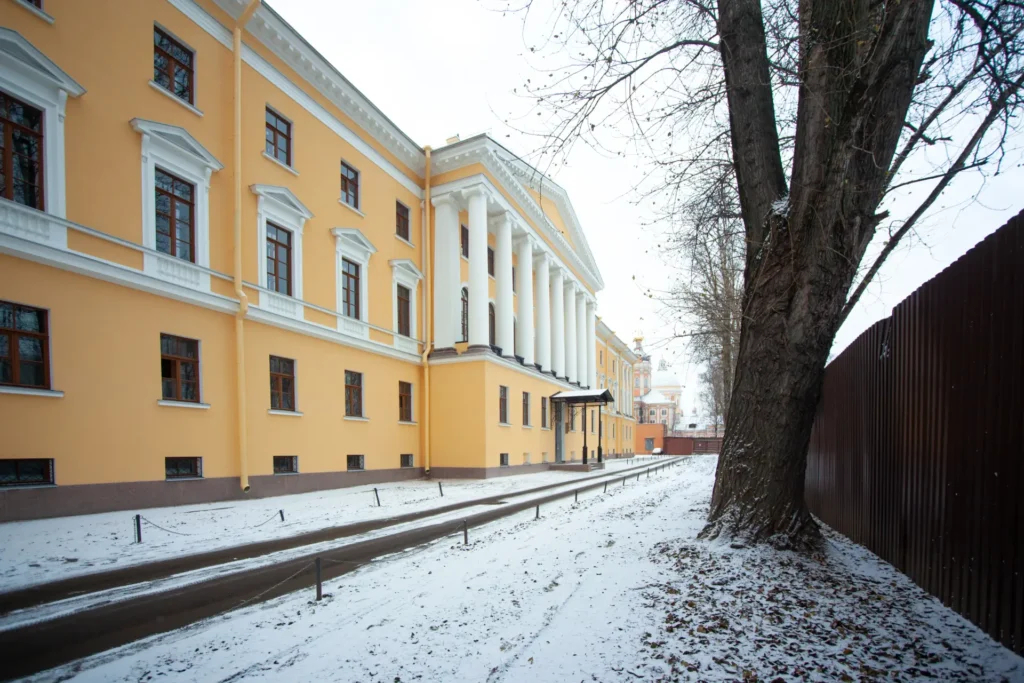 Главное здание Духовной академии, которое построили в 1817-1820 годах, является ярким примером петербургского классицизма. Его возвели в форме замкнутого каре с внутренним двором. Такое решение подчеркивает симметрию фасадов.